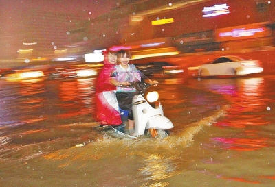 昨晚11時(shí)30分許,經(jīng)三路上兩個(gè)女孩騎著電動(dòng)車走在“汪洋”中。