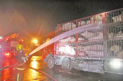 救援的消防官兵告訴大河報記者,現(xiàn)場需緊急救援的共有3輛運豬車,約300頭豬。了解情況后,消防官兵隨即利用水槍向生豬噴水降溫,一個多小時,原來無精打采的生豬開始活泛起來,待高速通行司機連忙開往目的地。