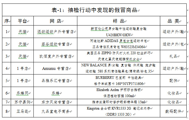 工商總局公布“雙11”期間對電商平臺促銷商品的抽檢結(jié)果:已確認(rèn)8批次樣品為假冒商品,天貓3個(gè),1號店2個(gè),樂蜂網(wǎng)、蘇寧易購、亞馬遜各1個(gè);7批次樣品涉嫌假冒商品正在分析中。另有7批次樣品質(zhì)量不合格或標(biāo)簽不合法。