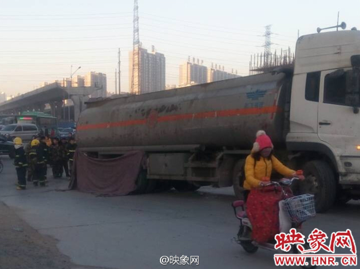 今天(1月19日)早上7點(diǎn)20分左右,鄭州市中州大道航海路上,一輛油罐車將一騎電瓶車男子碾倒在車下,事故現(xiàn)場(chǎng)被布遮擋,估計(jì)很慘。目前罐車司機(jī)已被控制住,事故還在處理中。