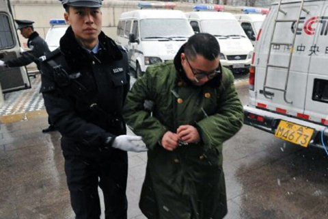 尹相杰頂著雪穿著綠色軍大衣被法警帶進(jìn)法院,等候?qū)徖?。朝?yáng)法院供圖