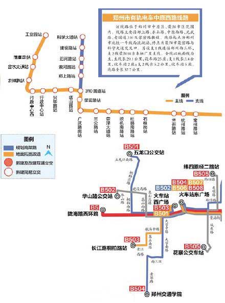鄭州市有軌電車中原西路線路起點為地鐵一號線西流湖站,終點為滎密路與科學大道交叉口。另設(shè)支1線連接鄭州西三環(huán),支2線滎陽四方車輛廠至主線。主要沿鄭上路、樂山路、中原西路、光武路、老國道310及滎密路敷設(shè)。