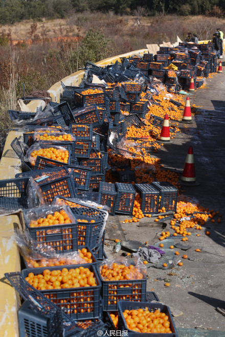 13日凌晨4時(shí)許,一輛滿載桔子的大貨車行經(jīng)昆明市東繞城高速公路時(shí)側(cè)翻,近30噸桔子灑落一地。數(shù)十村民貓著腰來(lái)揀桔子,有的拿筐,有的提袋…現(xiàn)場(chǎng)施救人員說(shuō),有些開車來(lái)?yè)專祹讉€(gè)來(lái)回了。駕駛員說(shuō),那些桔子破損嚴(yán)重,揀回來(lái)也不容易。