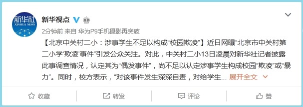 【北京中關村二小:涉事學生不足以構成“校園欺凌”】近日網曝“北京市中關村第二小學‘欺凌’事件”引發(fā)公眾關注。對此,中關村二小13日凌晨對新華社記者披露此事調查情況,認定其為“偶發(fā)事件”,尚不足以認定涉事學生構成校園“欺凌”或“暴力”。同時,校方表示,“對該事件發(fā)生深深自責,對給學生及家長帶來的傷害,深表歉意”,將汲取教訓,以此為鑒,本著認真理性、客觀公正的原則,妥善處理。(新華社記者魏夢佳、梁天韻)