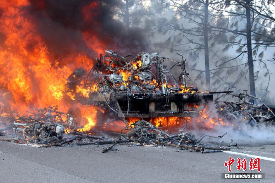 1月23日下午16時(shí)許,滬昆高速公路江西弋陽往貴溪方向593公樁(貴溪收費(fèi)站附近)一輛載有133部電動(dòng)車的半掛車起火,導(dǎo)致電動(dòng)車被大火“吞噬”。江西貴溪消防官兵接警后迅速到場撲救,半小時(shí)后將大火撲滅。據(jù)司機(jī)稱,火災(zāi)疑因高速護(hù)坡雜草叢起火產(chǎn)生的火芯飄至半掛車,引燃包裝電動(dòng)車的紙殼箱所致。中新社發(fā) 龔武 攝