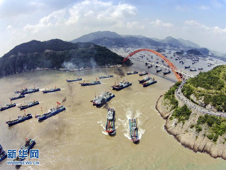 9月16日,浙江省舟山市沈家門漁港的漁船出港經(jīng)過(guò)朱家尖大橋開(kāi)赴漁場(chǎng)。當(dāng)日,為期3個(gè)半月的東海伏季休漁結(jié)束,眾多漁船劈波斬浪,開(kāi)往漁場(chǎng)。 新華社發(fā)(華志波 攝)