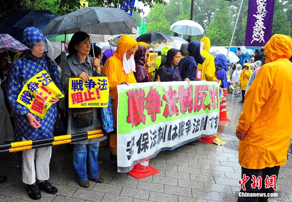 隨著安倍陣營強推以解禁集體自衛(wèi)權為核心內容的安保法案最終過關的計劃進入“倒計時”,日本民眾的反安保抗議活動再度進入高潮。在之前徹夜抗議之后,9月17日白天,又有眾多日本民眾冒著大雨持續(xù)聚集在國會周邊進行抗議活動。中新社發(fā) 王健 攝