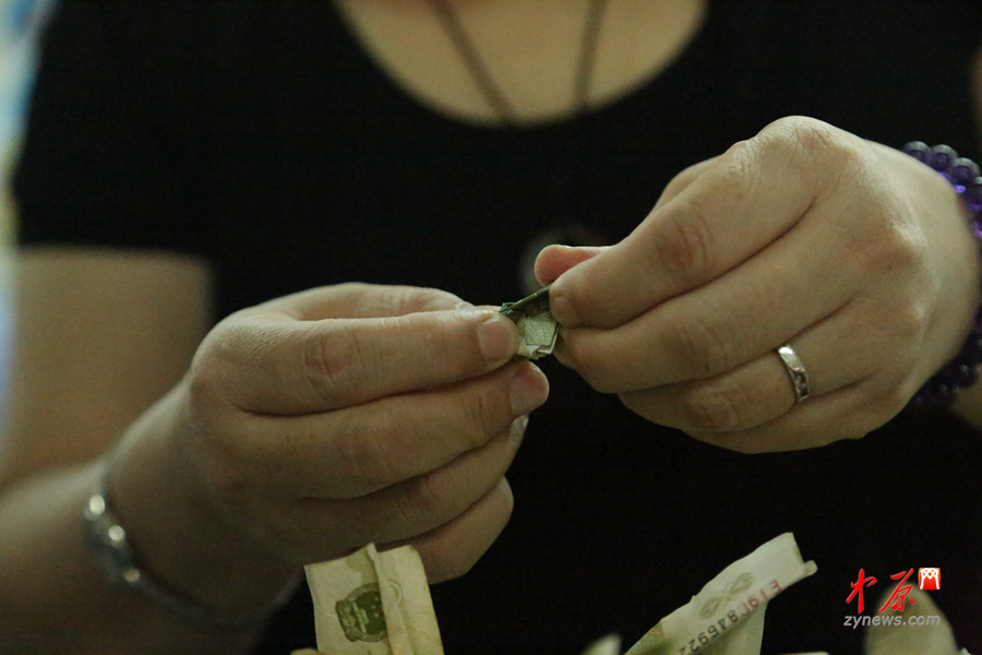 工作人員展示出一張被折疊成小紙船的紙幣,她勸乘客不要給點(diǎn)鈔員人為增加工作難度。