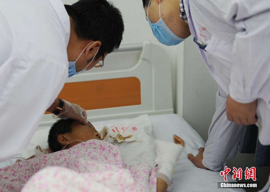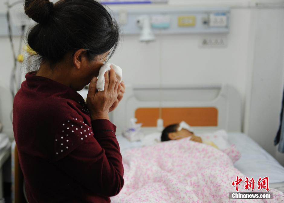 10月13日,12歲的朱某正在吉林大學(xué)第二醫(yī)院接受治療。據(jù)其家人介紹,10月11日,朱某獨(dú)自在家,遭同村村民王某挖出雙眼,行兇者還點(diǎn)燃了他家的房子,朱某靠裝死逃過(guò)一劫。王某事后自殺。目前雖經(jīng)手術(shù)治療,但朱某右眼視力已無(wú)恢復(fù)的可能,左眼亦不樂(lè)觀。警方正對(duì)此案進(jìn)行調(diào)查。中新社記者 張瑤 攝