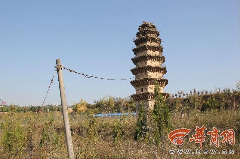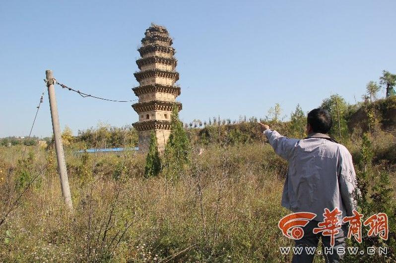 12日,住在離塔不遠(yuǎn)處的村民趙先生告訴華商報記者,在他的印象中,這座塔發(fā)生傾斜已經(jīng)有20多年了,大約在2005年前后。銅川新區(qū)管委會的工作人員在塔身上系上了一根鋼索,目的是為防止塔身繼續(xù)傾斜?!摆s緊把這塔保護(hù)一下,再不保護(hù)這塔可能就沒有了?!壁w先生說,除了傾斜、風(fēng)蝕,導(dǎo)致塔體破壞外,偶爾還有盜墓賊光顧,他們在他周圍打了好幾個盜洞,這也加速了塔的破壞。