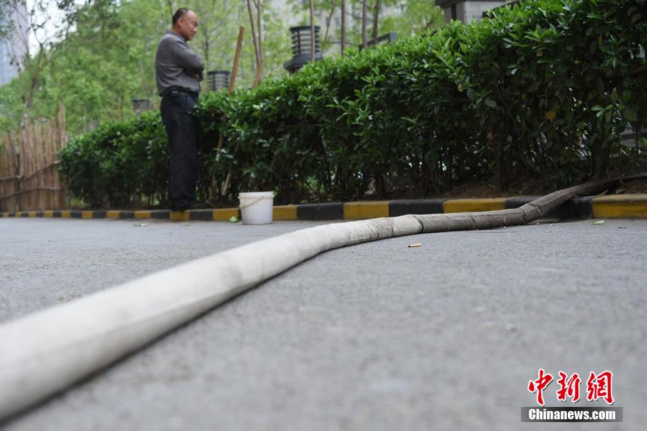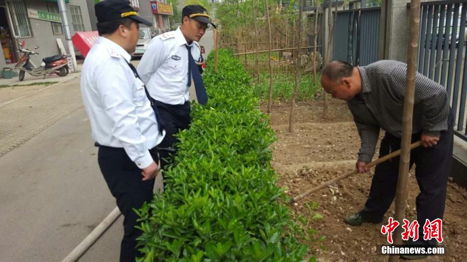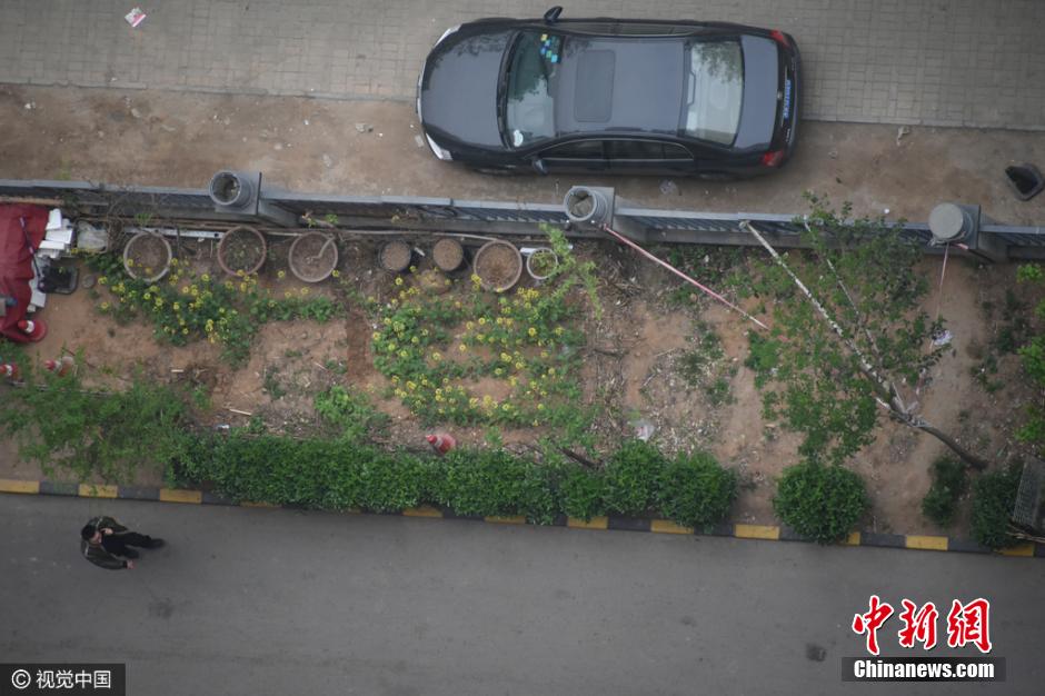 水管是從20樓放下來的,小菜園的主人用它來澆水。”未來路巡防隊員司廣紅說。在小菜園旁邊站著一名中年男子,手里拿著鐵锨。男子說,他是燕莊村民,姓張,家住9號樓20層。 李四信 攝 圖片來源:視覺中國