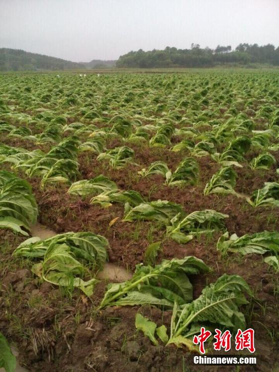 5月4日至5日,地處湘南的永州市道縣遭遇龍卷風(fēng)和暴風(fēng)雨襲擊,部分鄉(xiāng)鎮(zhèn)的樹木被大風(fēng)攔腰折斷或連根拔起,46個(gè)行政村電力中斷,當(dāng)季農(nóng)作物特別是烤煙大面積受災(zāi)。目前,該縣已迅速組織2000余名各級(jí)干部,深入災(zāi)區(qū)組織搶險(xiǎn)救災(zāi)。圖為龍卷風(fēng)過(guò)后烤煙大面積倒伏。 道縣宣傳部 供圖