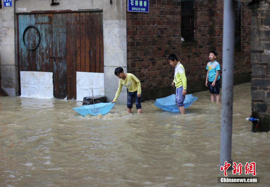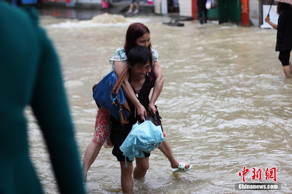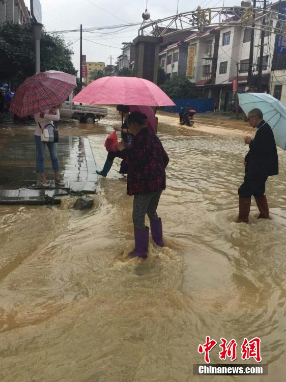 5月5日,地處湘南的永州市道縣遭遇暴風(fēng)雨襲擊,縣城內(nèi)多處低洼路段被水淹沒(méi)。當(dāng)?shù)胤姥床块T正嚴(yán)密監(jiān)控雨情、水情,確保安全度汛。圖為市民趟水出行。 中新社發(fā) 何紅福 攝