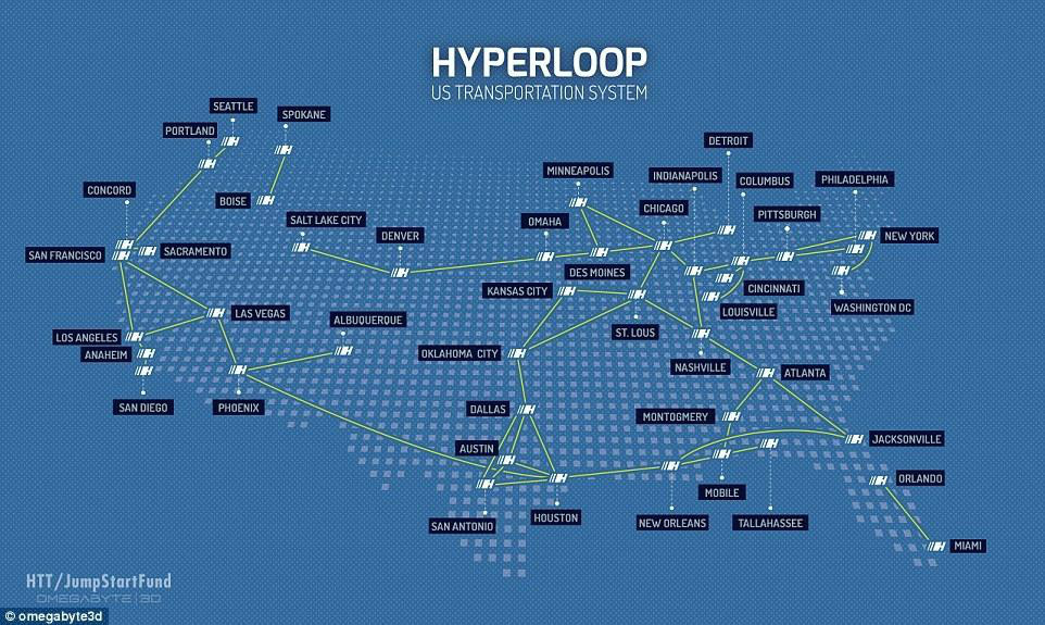 馬斯克在提出超級高鐵概念時曾說它是協(xié)和式超音速噴射客機、軌道炮和空氣球臺的交叉結(jié)合,圖為HTT公司想架設超級高鐵的地區(qū)路線圖。