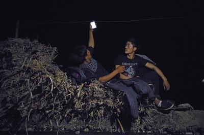 圖為5月12日晚上,村民坐在玉米稈上搜尋手機信號,村里沒有發(fā)射塔,全靠山下發(fā)射到的微弱信號接收手機短信和打電話。9點多鐘,勒爾小學校長吉克拉者帶著15個孩子到山下,其中有陳古吉的5個孩子,4個女孩1個男孩,最小的男孩叫陳木黑,6歲,讀學前班。爬山開始前,陳木黑被陳古吉系上背包繩。前面由一個家長引路,中間一個家長,陳古吉帶著陳木黑走最后,6歲的陳木黑已經(jīng)在這條路上,上上下下幾十次了。在爬垂直藤梯的時候,陳古吉會從后面微微提繩,讓兒子能夠省點力氣,跟上前面的哥哥姐姐。在通過沒有任何附著物的崖壁上的道路時,陳古吉就格外小心,緊抓繩子的手有時青筋暴起。他說,前些日子,一個娃滑了一下,幸好崖邊的藤條擋住了,才撿回一條命。