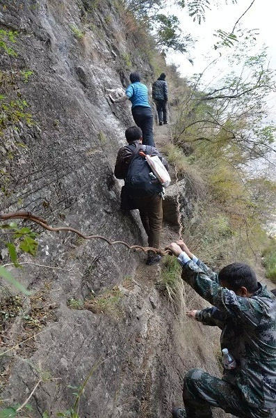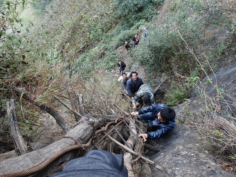 15個孩子中多數(shù)是女孩,在三個家長的保護下,背著沉沉的書包,大約用了2個小時,到達“懸崖村”。村里通向外界,需要順著懸崖斷續(xù)攀爬17條藤梯,其中接近村莊的幾乎垂直的兩條相連的藤梯長度約100米,沒有藤梯的崖壁才是最危險的。據(jù)支爾莫鄉(xiāng)黨委書記阿皮幾體講,他知道的在這條路上摔死的人有七八個,有村里的人,也有外來的人,而摔傷的人更多。