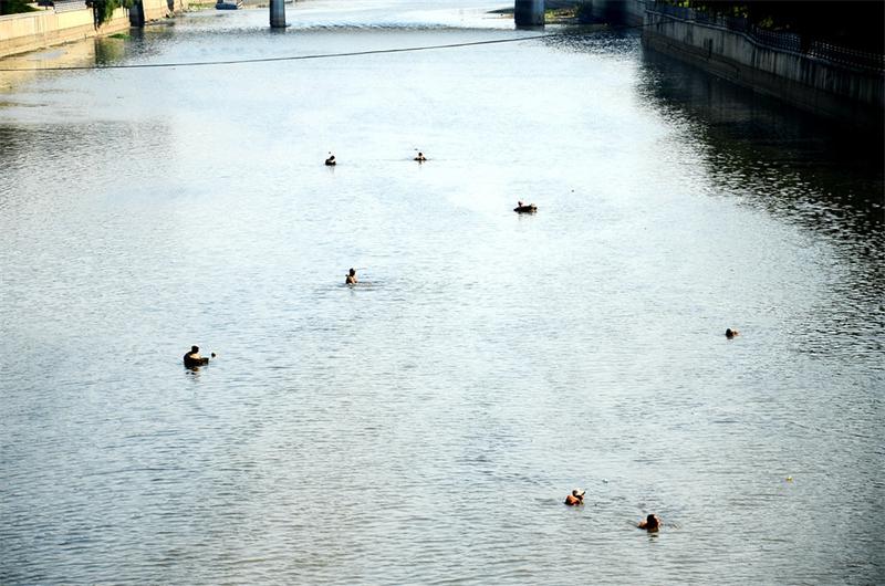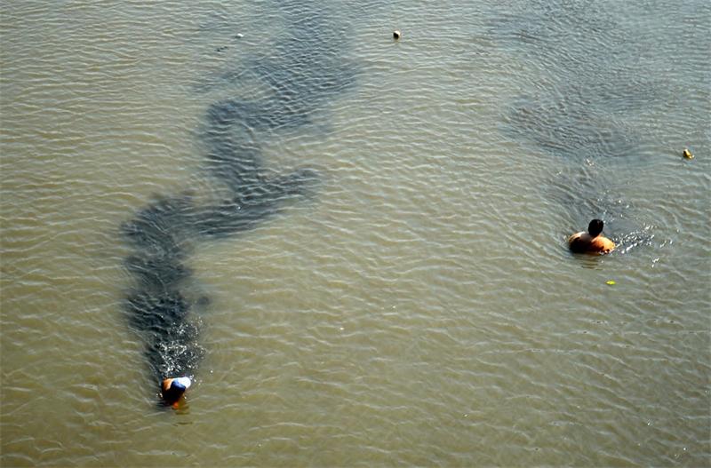 22日,在濟濼橋下的小清河,10多名男子整個身體浸泡在水中,只有頭部露出水面。