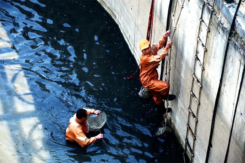 據(jù)了解,近期小清河開閘防水,河道水深不足1米,這幾名男子從河岸上放下軟梯,進入河中捕撈紅線蟲。