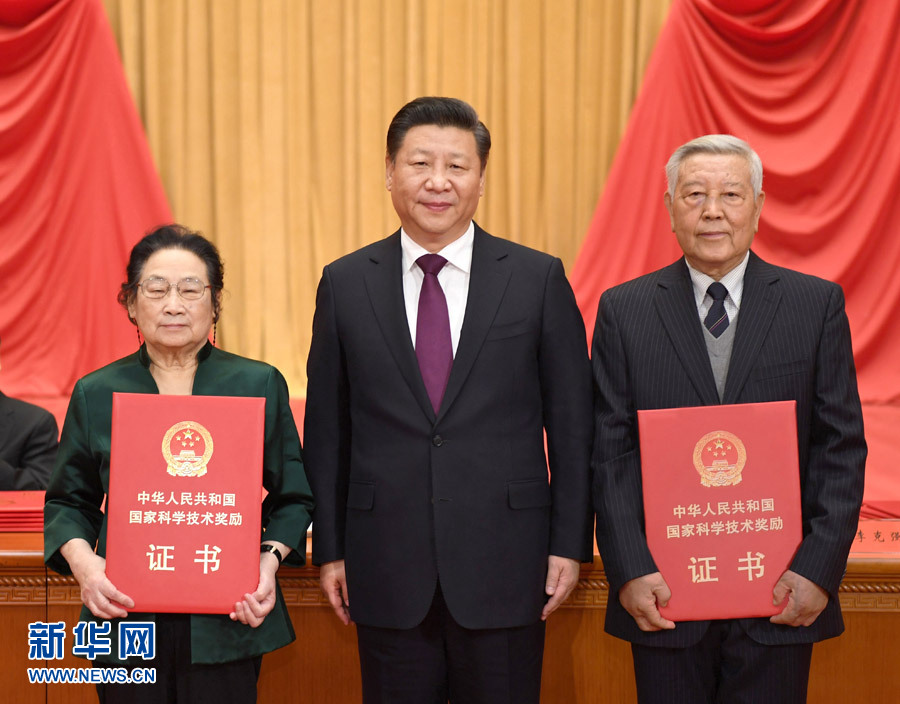 1月9日,2016年度國(guó)家科學(xué)技術(shù)獎(jiǎng)勵(lì)大會(huì)在北京人民大會(huì)堂隆重舉行。中共中央總書記、國(guó)家主席、中央軍委主席習(xí)近平向獲得2016年度國(guó)家最高科學(xué)技術(shù)獎(jiǎng)的中國(guó)科學(xué)院物理研究所趙忠賢院士(右)和中國(guó)中醫(yī)科學(xué)院屠呦呦研究員(左)頒獎(jiǎng)。新華社記者 李學(xué)仁 攝
