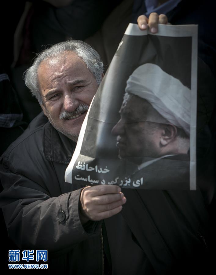 1月10日,在伊朗德黑蘭,一名男子手持伊朗前總統(tǒng)阿克巴爾·哈什米·拉夫桑賈尼的照片。新華社發(fā)(艾哈邁德·哈拉比薩斯攝)