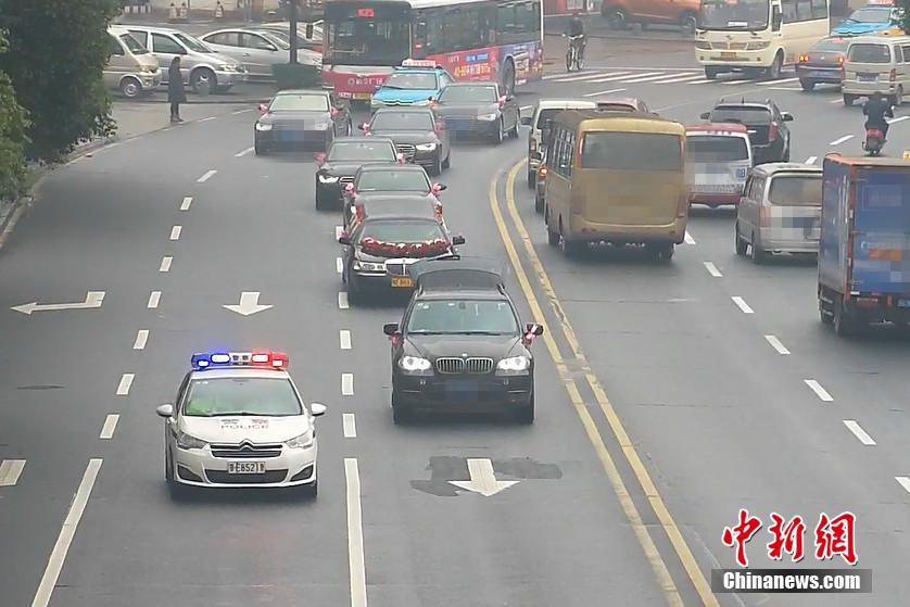 2月22日,湖北宜昌一位新郎在迎親時,迎親車隊的頭車因涉嫌套牌被交警查獲。在新郎家屬和交警溝通后,當(dāng)?shù)亟痪诵曰瘓?zhí)法,先“開道護送”,迎親結(jié)束后才扣下套牌車。圖為警車“護送”新人完成儀式。石寧 攝