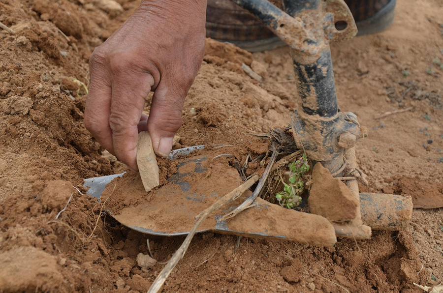 說(shuō)是鋤,看起來(lái)又像犁,地里有墑,用一段就要用瓦片把泥土刮去,要不推起來(lái)就會(huì)費(fèi)力,這個(gè)動(dòng)作和鋤地一樣,鋤過(guò)地的都知道。