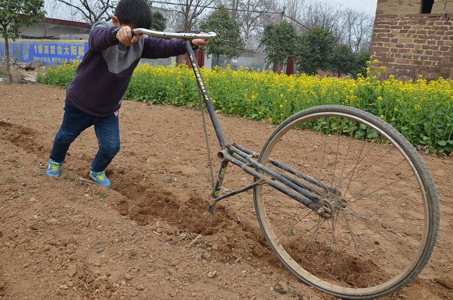 這種種菜的小地塊,推拖拉機(jī)過(guò)來(lái)翻有點(diǎn)兒擱不住,拿鋤頭鋤又有些費(fèi)力,還好有這個(gè)神奇單車,連小孩子都能干活了。
