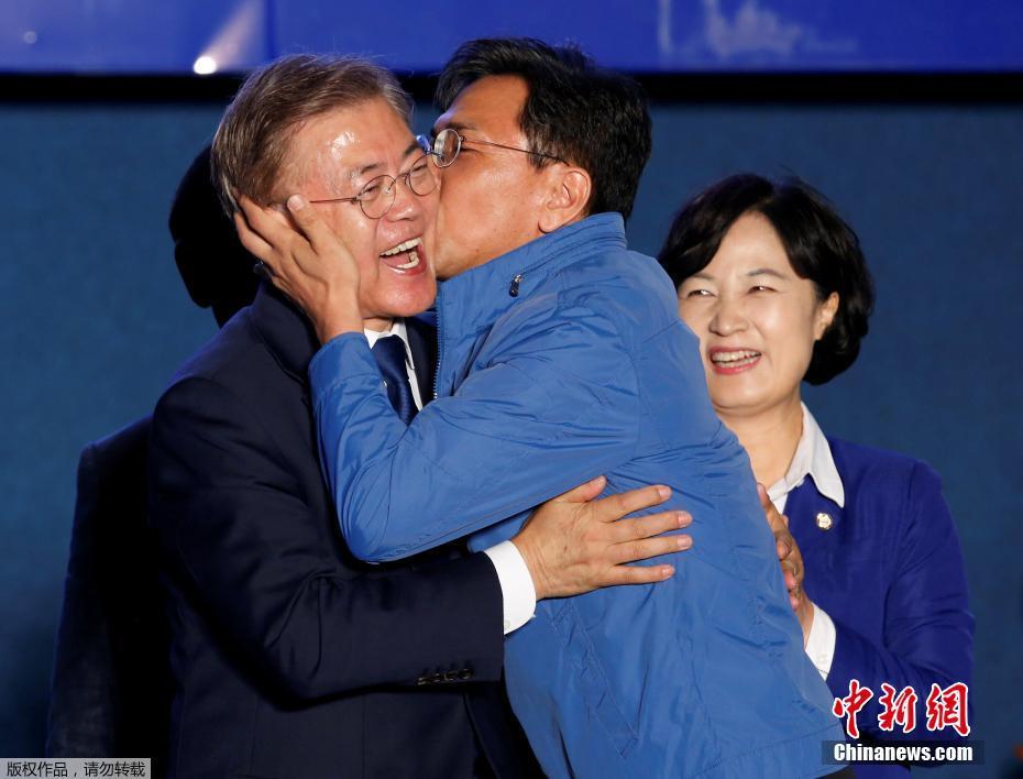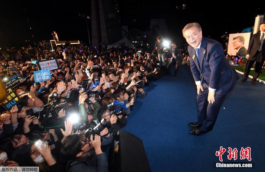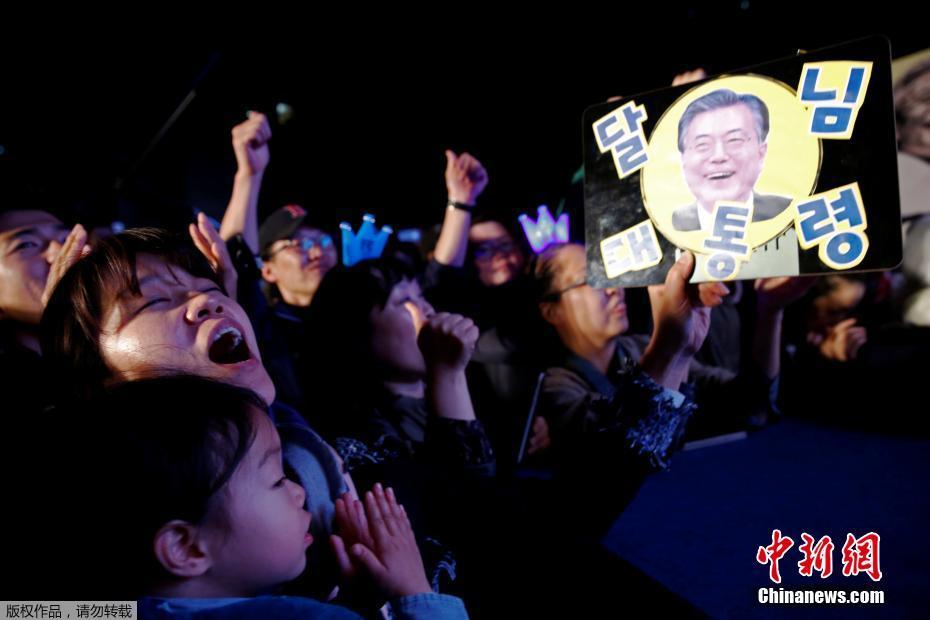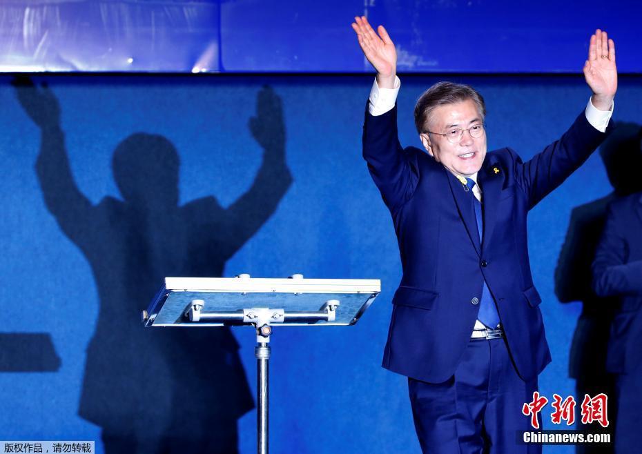 當(dāng)?shù)貢r(shí)間5月9日深夜,韓國(guó)第19屆總統(tǒng)選舉共同民主黨候選人文在寅及其競(jìng)選團(tuán)隊(duì)現(xiàn)身首爾光化門廣場(chǎng),發(fā)表“勝選演說(shuō)”,與支持民眾握手慶祝。據(jù)出口民調(diào)顯示,文在寅在當(dāng)日進(jìn)行的大選投票中以41.4%的支持率絕對(duì)優(yōu)勢(shì)勝選。在選舉管理委員會(huì)公布的大部分開票結(jié)果中,文在寅得票率也遙遙領(lǐng)先,提前鎖定勝局。