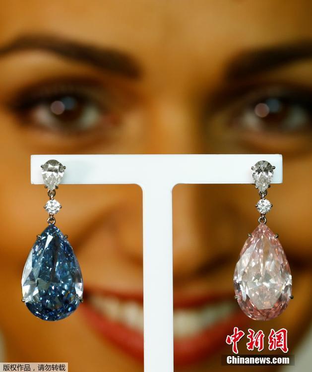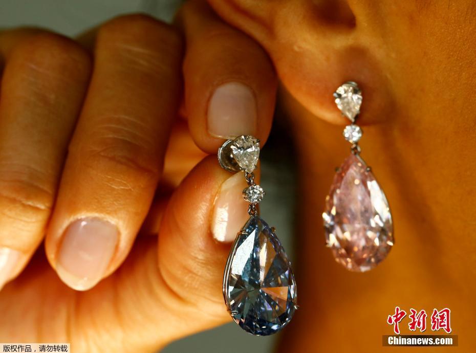 當(dāng)?shù)貢r間2017年5月11日,瑞士日內(nèi)瓦,14.54克拉的“阿波羅藍(lán)”和16克拉的“阿耳特彌斯粉”鉆石耳環(huán)即將在蘇富比拍賣行拍賣,估價分別為3800-5000萬美元和1250-1800萬美元。