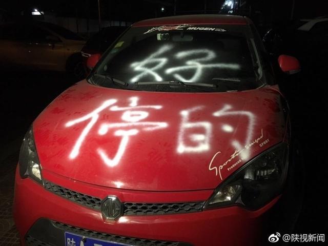 男子到西安方新路吃飯,因?yàn)闆]車位就把車停在道沿中間,擔(dān)心自己的車會(huì)擋別人道,他專門留下了聯(lián)系方式??墒浅酝晖盹埡笏氐杰嚫皡s看到自己的車被人噴了漆,寫了三個(gè)字“停的好”。