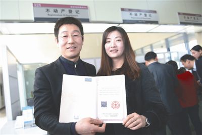 3月1日,在江蘇徐州市不動產(chǎn)登記交易服務(wù)中心,市民邢衛(wèi)鋒、趙媛媛夫婦在展示編號為001的不動產(chǎn)權(quán)證書。當日,《不動產(chǎn)登記暫行條例》開始施行。國土資源部部長姜大明在江蘇徐州市為申請領(lǐng)證的市民頒發(fā)了全國第一本不動產(chǎn)權(quán)證書。新華社發(fā)