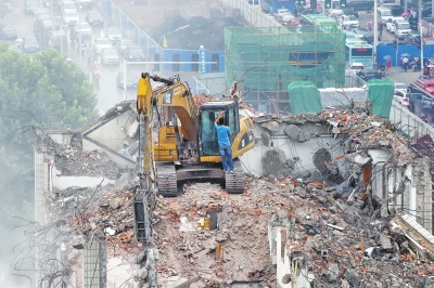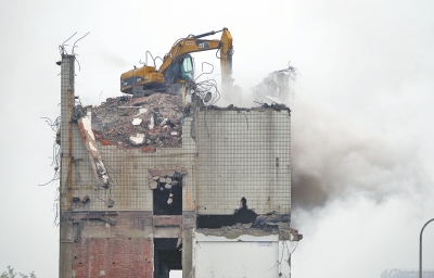 一輛拆遷機(jī)械正在對建筑進(jìn)行粉碎,揚塵滿天飄散。