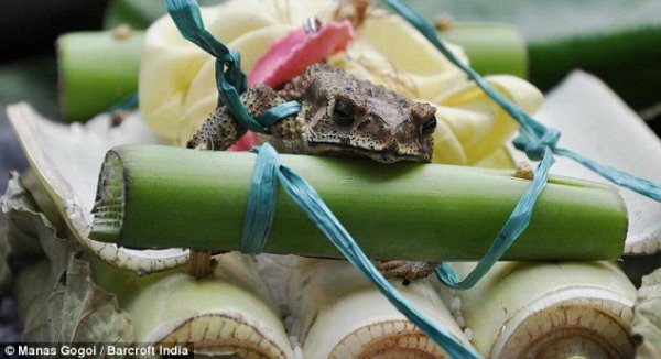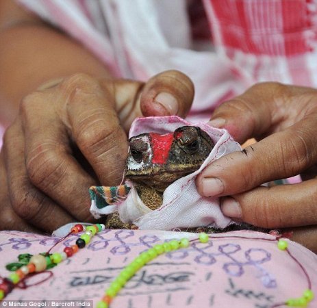 人們從四面八方的村子趕過(guò)來(lái)參加6月27日舉行的時(shí)長(zhǎng)6個(gè)小時(shí)的奇妙的婚禮。達(dá)斯介紹有超過(guò)1000多人參加了在當(dāng)?shù)毓珗@舉行的婚禮。兩只青蛙被用傳統(tǒng)顏色盛裝打扮,其中雌性青蛙甚至被村民用金色的鏈子纏裹住。