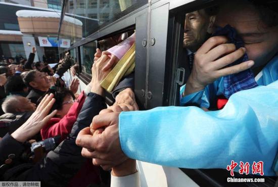 資料圖:圖為當(dāng)?shù)貢r間2014年2月25日,韓朝離散家屬第二輪會面活動結(jié)束,親屬間揮淚話別。