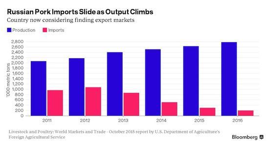 據(jù)彭博社報(bào)道,美國農(nóng)業(yè)部數(shù)據(jù)顯示,俄羅斯國內(nèi)豬肉產(chǎn)量四年里增加了26%,創(chuàng)下了歷史最高水平;與此同時(shí),進(jìn)口從2012年的峰值下降了超過80%。