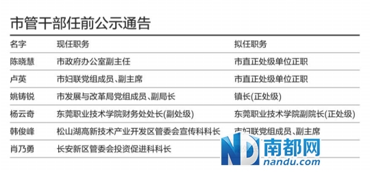 此外,東莞職業(yè)技術(shù)學(xué)院財務(wù)處處長(副處級)楊云奇將擬任東莞職業(yè)技術(shù)學(xué)院副院長(正處級);長安新區(qū)管委會投資促進(jìn)科科長肖乃勇則擬任副處長。