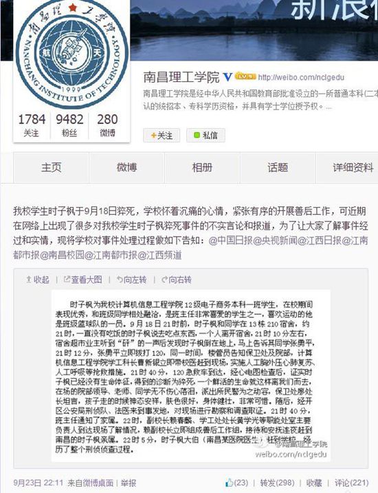 9月23日,南昌理工學(xué)院發(fā)布官方微博,就時(shí)子楓猝死一事解釋稱,事發(fā)后,時(shí)子楓的同學(xué)撥打了120,同一時(shí)間,樓管員通知了保衛(wèi)處以及院部,相關(guān)領(lǐng)導(dǎo)趕到現(xiàn)場急救,21時(shí)40分,120急救到場后,證實(shí)時(shí)子楓已經(jīng)沒有生命體征,被診斷為猝死。該校的官微還指出,網(wǎng)上出現(xiàn)了一些不實(shí)言論,特此澄清,但并未解釋死因以及打人之事。