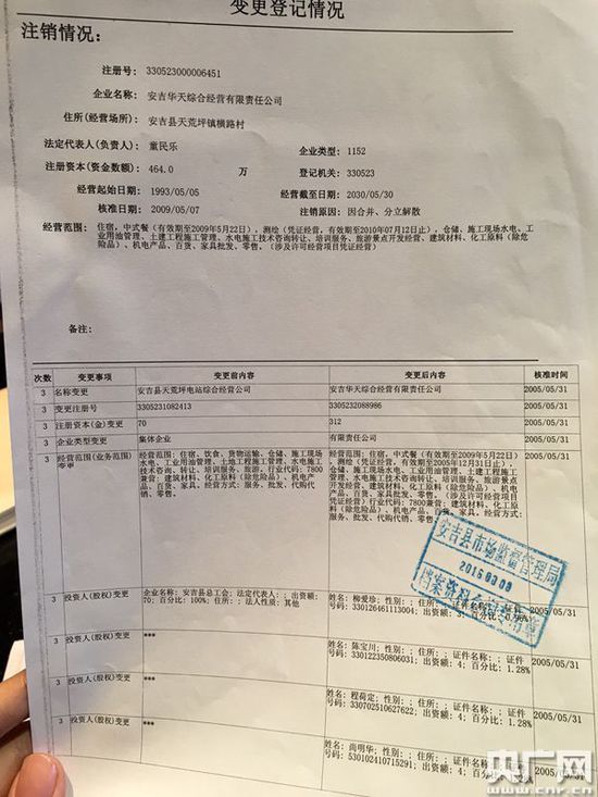 對(duì)此,王安培在接受記者采訪時(shí)稱,自己在2009年退休前,的確是電站工會(huì)主席,但江南天池公司和電站沒有關(guān)系:“我退休之前是電站的工會(huì)主席,09年退休,之前是不能搞三產(chǎn)的,這個(gè)我們是有規(guī)定的。10年推我當(dāng)董事長(zhǎng),變更法人成我的。錢源是我們退休的老同志,大家出點(diǎn)錢,在杭州注冊(cè)了一家錢源公司,拿了一點(diǎn)錢在安吉搞了一個(gè)江南天池度假村,和原來的三產(chǎn)沒有延續(xù)?!?/p>