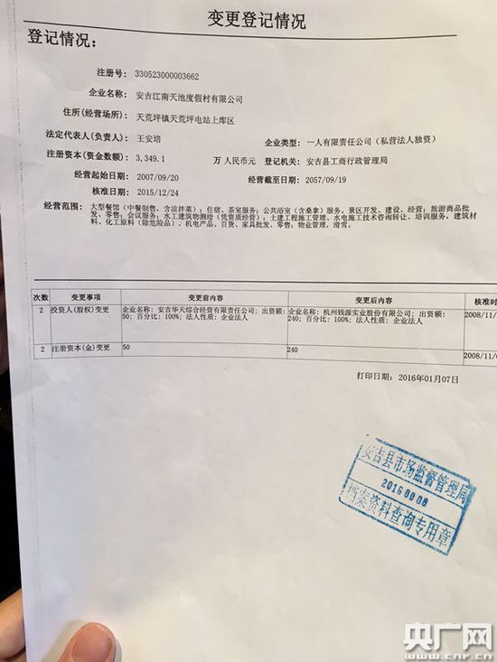 記者查詢安吉縣工商局登記信息發(fā)現(xiàn),江南天池度假村的前身就是天荒坪電站的三產(chǎn),天荒坪電站綜合經(jīng)營(yíng)公司,在2005年前屬于集體企業(yè),之后這家企業(yè)多次變身,成為了浙江錢源旅游開發(fā)股份有限公司,江南天池公司就是錢源的全資子公司,2010年后,兩家企業(yè)的法人代表變?yōu)殡娬厩肮?huì)主席王安培。