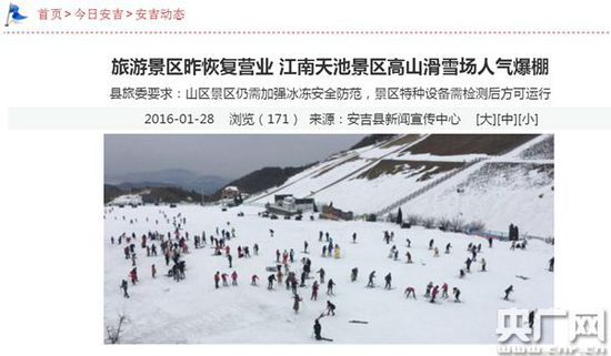 雖然安吉縣委宣傳部副部長(zhǎng)祝青稱滑雪場(chǎng)營(yíng)業(yè)馬上就結(jié)束了,但根據(jù)安吉縣政府官方網(wǎng)站報(bào)道,1月28號(hào),江南天池滑雪場(chǎng)恢復(fù)營(yíng)業(yè),人氣爆棚。