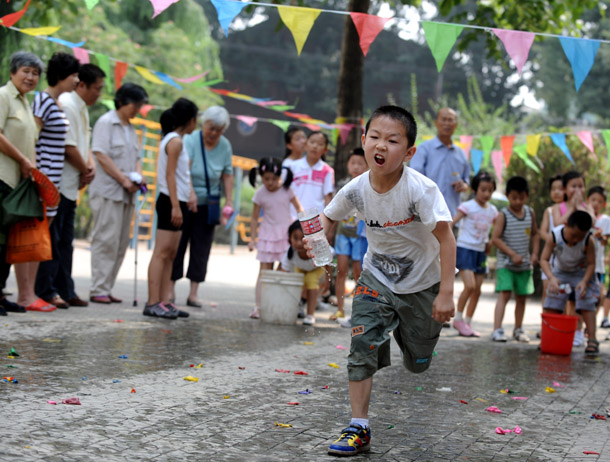 游戲規(guī)則:跑道前方設(shè)置一個(gè)水桶 起點(diǎn)外設(shè)置一個(gè)大塑料瓶,比賽開始時(shí),小朋友持水杯到水桶內(nèi)盛水后返回倒入大塑料瓶處,由孩子和兩個(gè)家長(zhǎng)依次進(jìn)行盛水接力,大塑料瓶盛滿水者為勝(注:塑料瓶身內(nèi)設(shè)若干漏點(diǎn))。活動(dòng)共7個(gè)家庭參與,取前三名進(jìn)行頒獎(jiǎng),所有參與的家庭均有參與獎(jiǎng)。