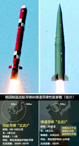 據(jù)韓國(guó)《朝鮮日?qǐng)?bào)》20日?qǐng)?bào)道,韓國(guó)19日首次對(duì)外公開了自制巡航導(dǎo)彈和彈道導(dǎo)彈。巡航導(dǎo)彈“玄武-3”最大射程1500公里,可精確打擊朝鮮全境核與導(dǎo)彈基地等主要戰(zhàn)略設(shè)施;彈道導(dǎo)彈“玄武-2”射程300公里,一發(fā)可將幾十個(gè)足球場(chǎng)大的面積夷為平地。