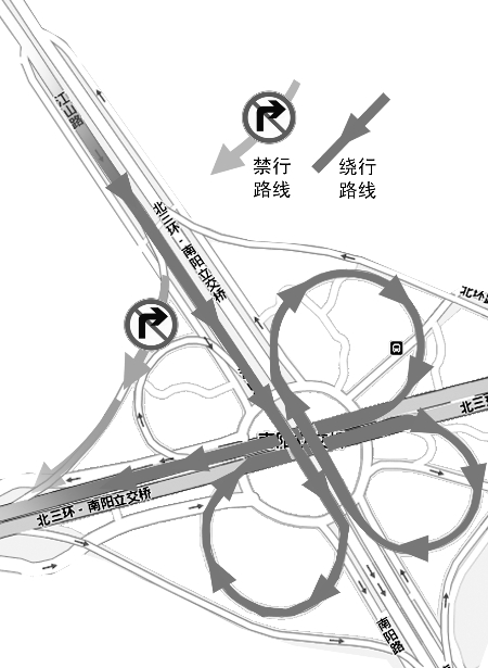 鄭州交巡警支隊有關(guān)負責人建議司機在北環(huán)立交橋上通過連續(xù)轉(zhuǎn)彎實施右轉(zhuǎn)(可參照圖示),具體如下: