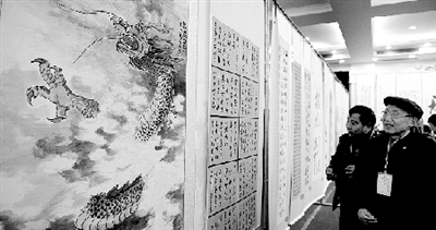第三屆全國(guó)炎黃書畫展在西亞斯學(xué)院開(kāi)幕。記者 張翼飛 圖