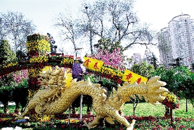 此次花展分別布置了“雙龍競春”、“綠島探春”等5個立體和平面花壇,有配花如牽?;?、三色堇等兩萬余盆,另有袖珍葉子、散尾葵、綠茉莉、夏威夷等近千盆點綴,其中景點“樂童嬉春”的“魔方”使用7000余枝鮮切花康乃馨制成。