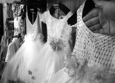 “這個(gè)送珍珠腰帶,走(賣)得可好,帶一件吧!”昨天下午2點(diǎn),鄭州市豐產(chǎn)路某店鋪內(nèi),女老板正在向一位女士推銷熱賣的“公主裙”。仔細(xì)看,這條粉紅色的裙子,腰間綴著由花生米大小的“珍珠”做的腰帶,袖口邊緣處還貼著亮閃閃的貼片,看著確實(shí)華麗。經(jīng)過一番討價(jià)還價(jià),該女士花100元為上幼兒園的女兒買了條裙子。令她不滿意的地方,就是似乎珍珠腰帶縫得并不緊,“珍珠是一根單線穿下來的,穿不了幾次,就該斷了”。