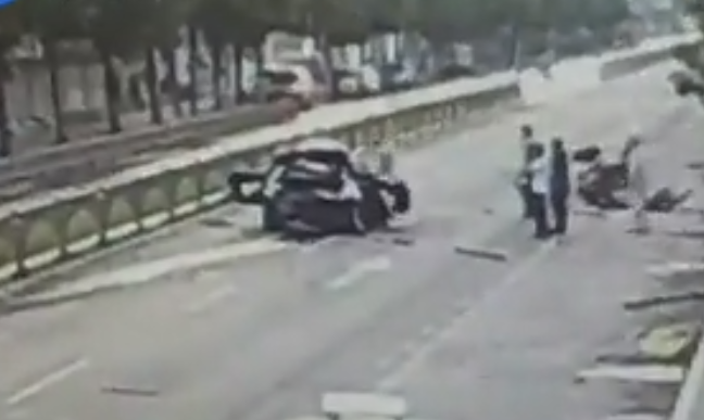 監(jiān)拍濟(jì)南寶馬車撞斷15節(jié)護(hù)欄