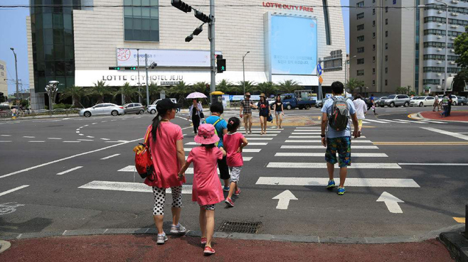 老人過(guò)馬路搶燈 被小孫子拽回