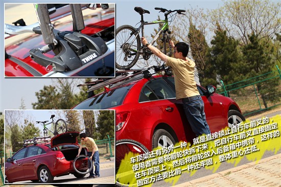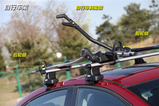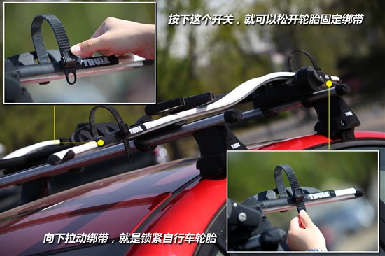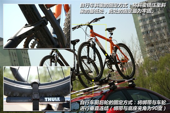 可能有人會(huì)覺(jué)得這樣安裝自行車還不是很把牢,那沒(méi)關(guān)系,您還可以選擇另一套安裝自行車的頂架,它的使用原理是將自行車的前輪卸下、前叉固定在頂架前部,它的好處是比直接固定自行車前輪更加牢固,且因缺少了自行車的前輪,導(dǎo)致車頂之上的物品重心更低,行車也更為安全;但這種方式對(duì)使用者的自行車有較高的要求,需要您的山地自行車前輪具有快拆的功能。