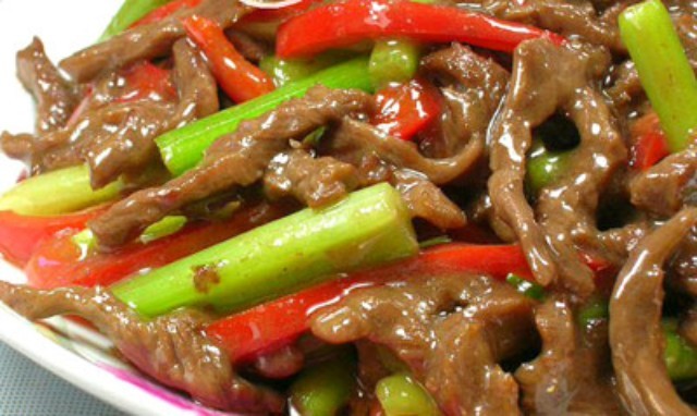 3.炒鍋上火,花生油燒至六成熱,放入牛肉片,用勺拌和,待牛肉色白時(shí),倒入漏勺瀝油;